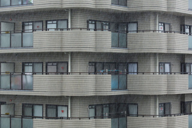広大な屋上や各戸のベランダは、防水層の経年劣化(ひび割れ、膨れ、破断)が主な原因です。排水口(ドレン)の詰まりや、屋上の縁に立ち上がるパラペット笠木の不具合も雨漏りを引き起こします。