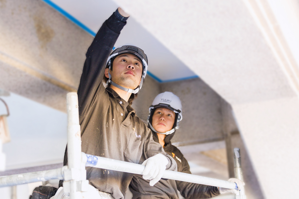 ゆうき総業には国家資格の「1級左官技能士」と「1級シーリング技能士」が複数名在籍。自社施工班として、高レベルかつスピーディーに下地処理のモルタル補修やシーリング補修を実現します。