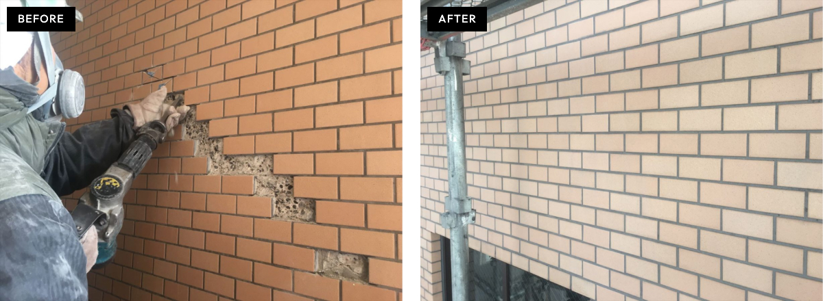 管理組合の予算制約もありましたが、打診調査でマーキングした箇所のみを慎重に撤去し、同じ色に焼いた新しいタイルで張り替えを実施しました。