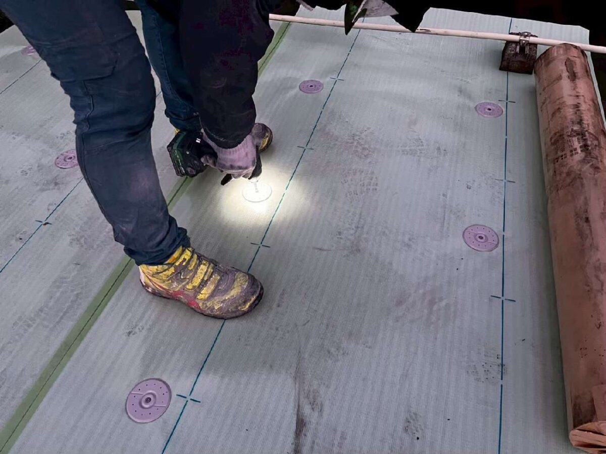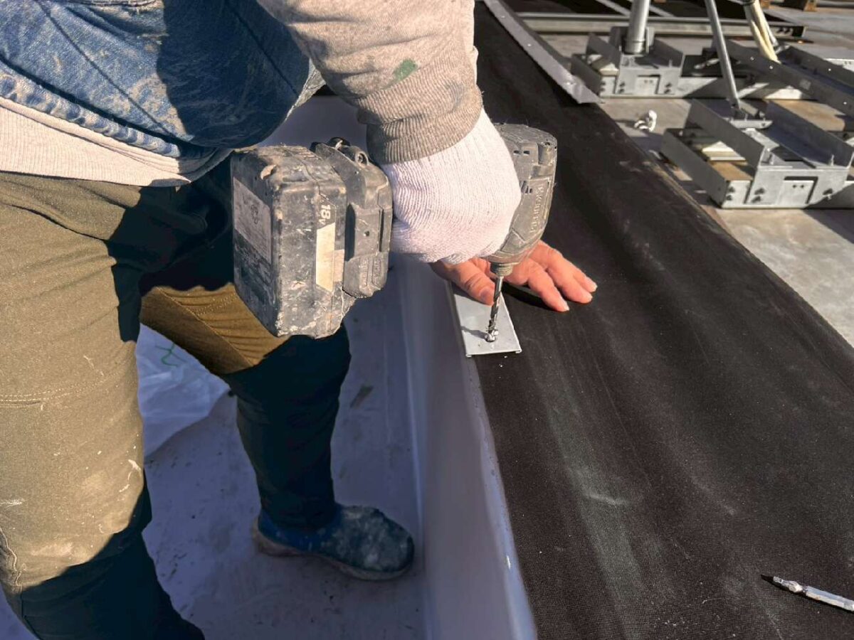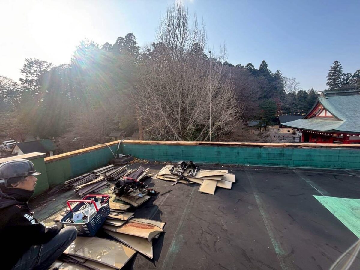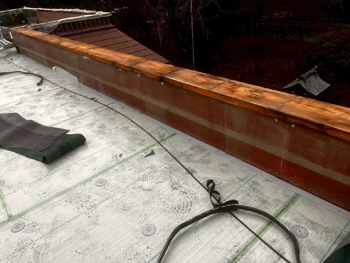 現地調査の結果、防水シートの浮きや劣化が広範囲に見られたため、既存シートの不良部分を撤去し、下地処理を行ったうえで新たに防水施工を実施しております。