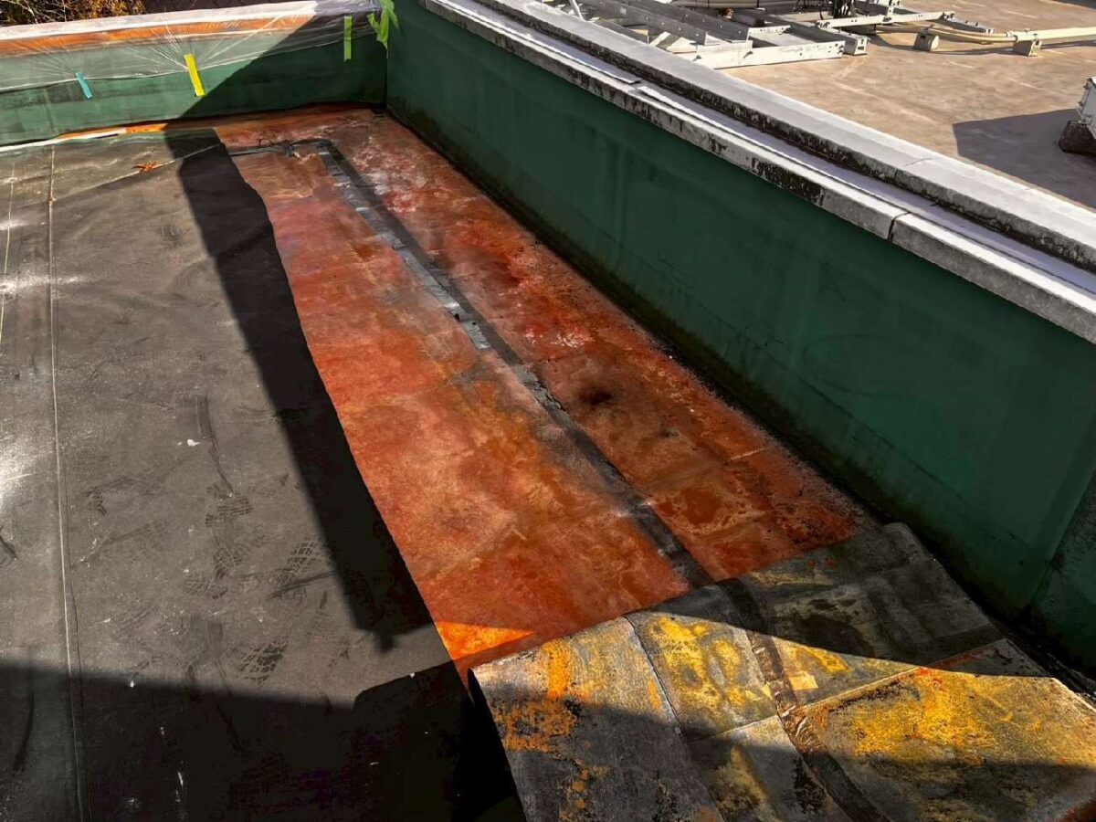 劣化した既存防水シートを撤去し、下地調整後に塩ビシート防水を施工。